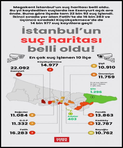 İkinci sırada yer alan Fatih’te de 16.283 ve üçüncü sıradaki Küçükçekmece’de de 14.977 suç kayıtlara geçti.
