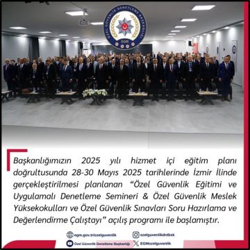 Özel Güvenlik Denetleme Başkanlığının 2025 yılı hizmet içi eğitim planı doğrultusunda 28-30 Mayıs 2025 tarihleri arasında İzmir İlinde planlanan "Özel Güvenlik Eğitimi ve Uygulamalı Denetleme Semineri & Özel Güvenlik Meslek Yüksekokulları ve Özel Güvenlik Sınavları Soru Hazırlama ve Değerlendirme Çalıştayı" başlamıştır.