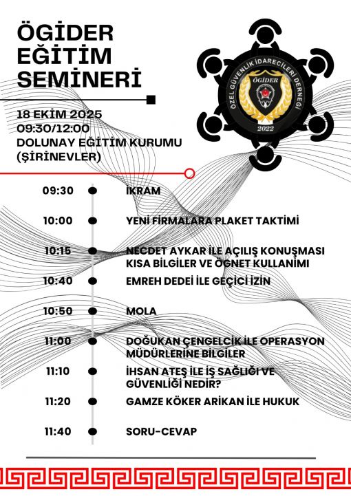 Özel Güvenlik Yönetici ve Müdürlerine ÖGİDER Eğitim Semineri ![]() Özel Güvenlik İdarecileri Derneği (ÖGİDER) tarafından 18 Ekim 2025 Cumartesi günü Şirinevler Dolunay Eğitim Kurumundan özel güvenlik yönetici ve müdürlerine "Mevzuat ve Uygulamaları" hakkında bilgilendirmek amacıyla seminer düzenlenmiştir.