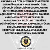 Sosyal sorumluluk kapsamında Özel Güvenlik İdarecileri Derneği (ÖGİDER) olarak, vefat eden iki Özel Güvenlik Görevlisi arkadaşımızın çocuklarının eğitim masrafını karşılama kararı aldık. Bahse konu iki ailenin çocuklarının önümüzdeki eğitim ve öğretim döneminde ihtiyaç duyacakları kırtasiye masraflarını üsleneceğiz. Ayrıca aynı eğitim ve öğretim dönemi süresince aylık 3.000 TL harçlık desteğinde bulunacağız. ÖGİDER olarak sosyal sorumluluk kapsamında desteklerimiz sürecektir. Vefat eden her iki arkadaşımıza Allah'tan rahmet dileriz. ÖGİDER Başkanı  Necdet AYKAR